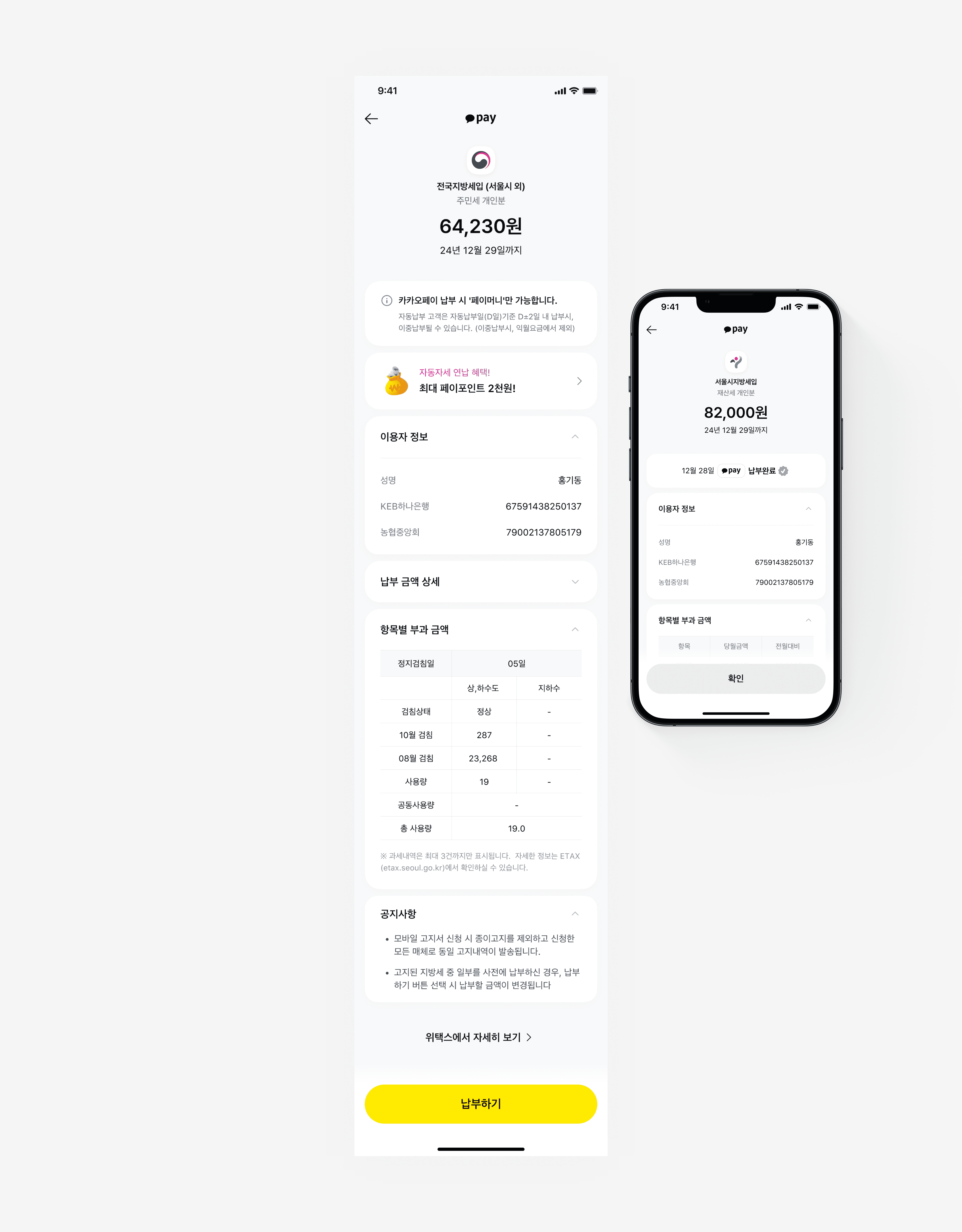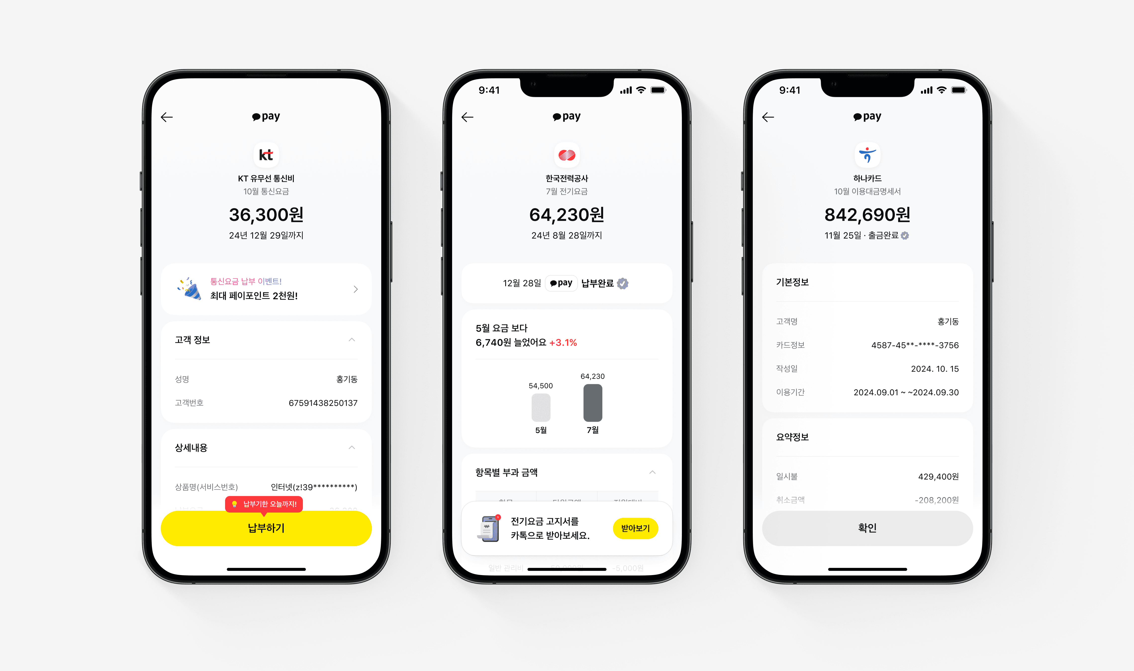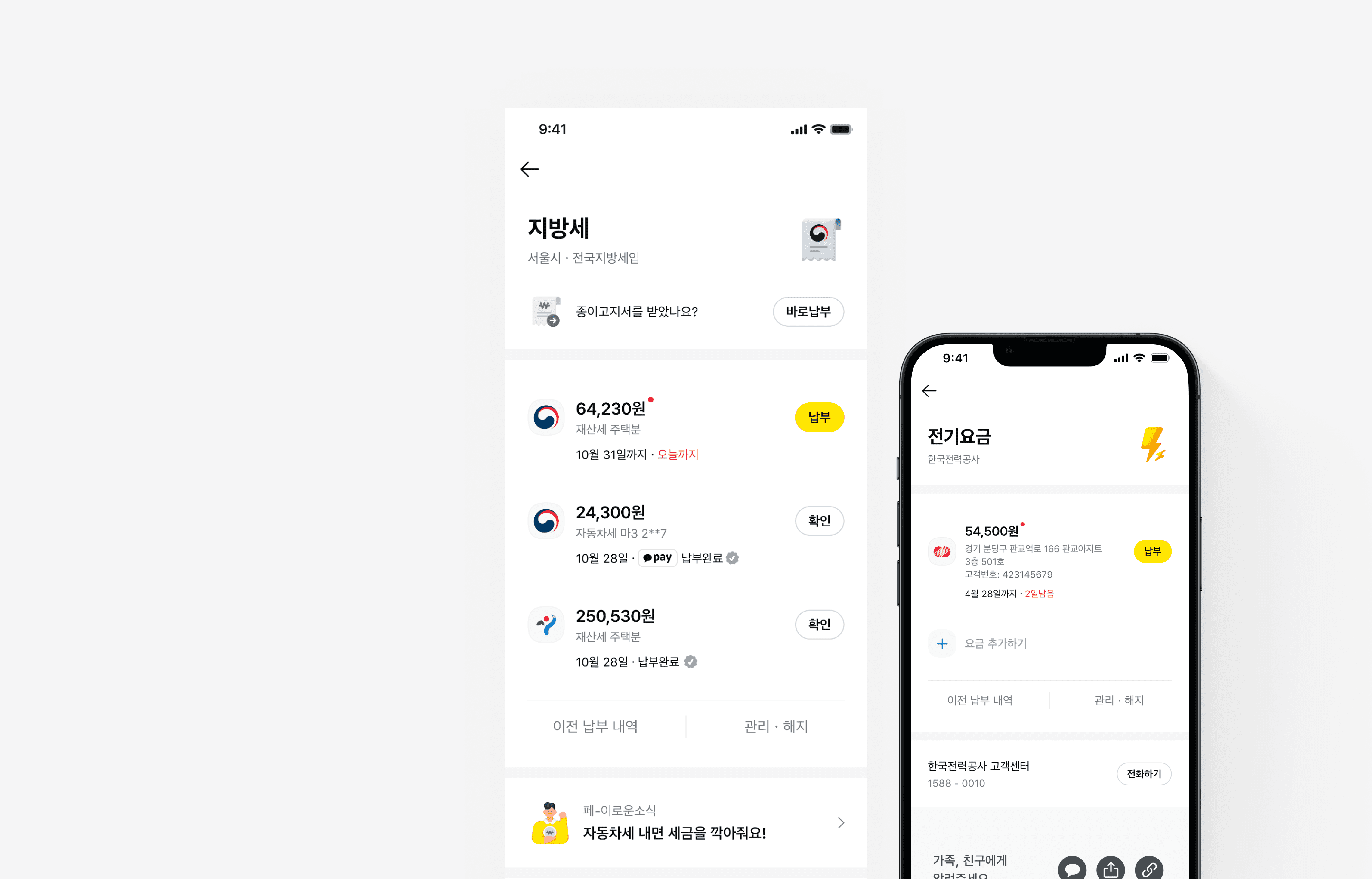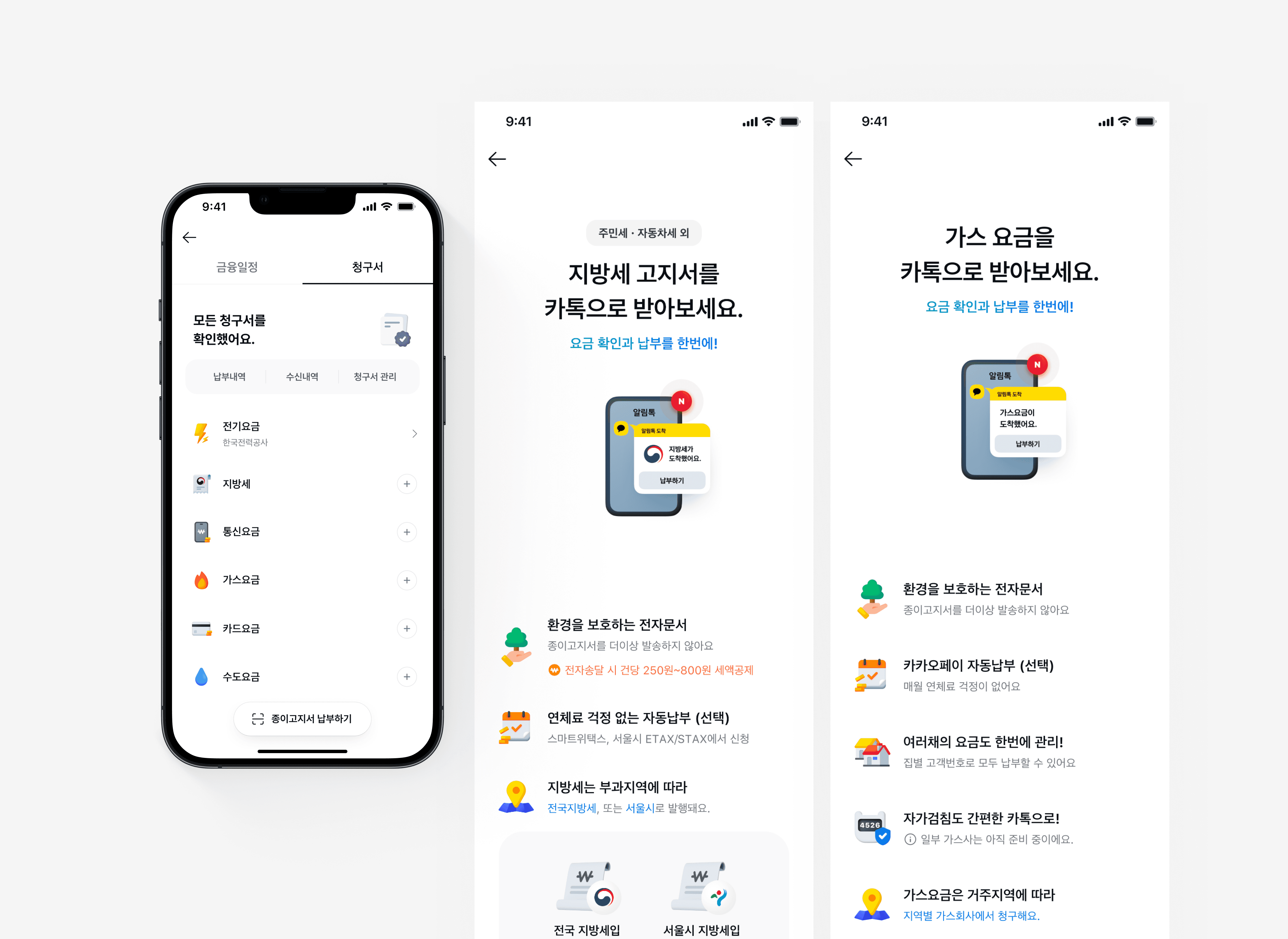 Kakao Pay Living bill payment is Korea's first mobile messenger-based electronic bill payment (EBPP) service. Manage all your scattered living expenses, gas and electricity bills, telecommunications charges, and local taxes all at once with Kakao Pay. From notifications received via KakaoTalk to payments, all in one place!